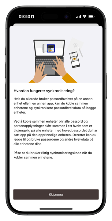 Du kan trykke på «Hvordan fungerer synkronisering?» for å lese litt mer om hvordan dette fungerer. Som det står forklart her, vil synkronisering innebærer at du slår sammen hvelv på tvers av dine enheter slik at alle passordene er tilgjengelige der du trenger de.